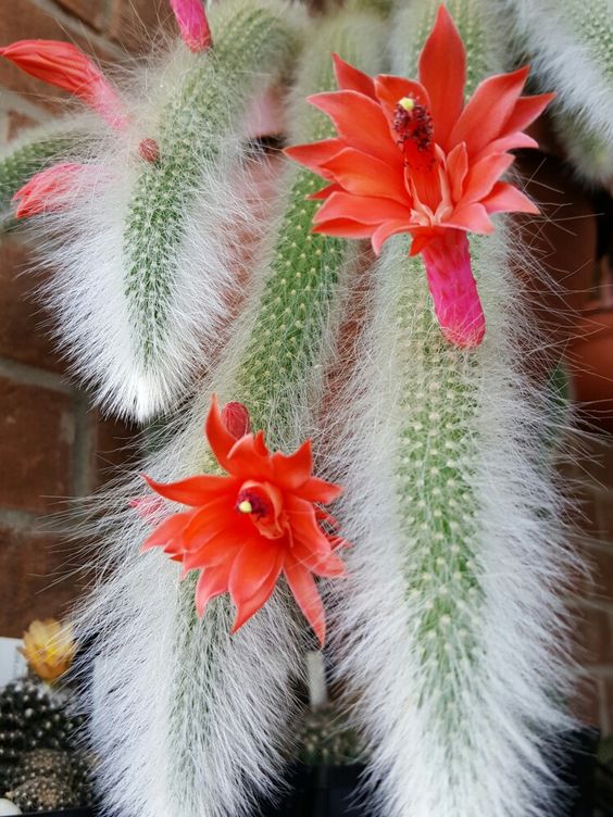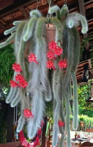 O Cacto Rabo de Macaco é a planta perfeita para quem deseja adicionar uma textura única ao ambiente. Nativo da Bolívia, este cacto pendente é famoso por seus longos ramos cobertos por cerdas brancas e macias, que lembram o pelo de um animal. Além do visual incrível, quando bem cuidado, ele presenteia o dono com flores vermelhas vibrantes e grandes que criam um contraste magnífico com o branco da planta.